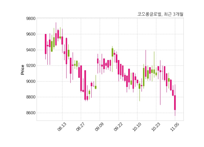 한편, 코오롱글로벌의 10시 43분 현재주가는 8,640원으로 직전 거래일 대비 180원(-2.04%) 하락이며, 거래량은 17,139주이다.