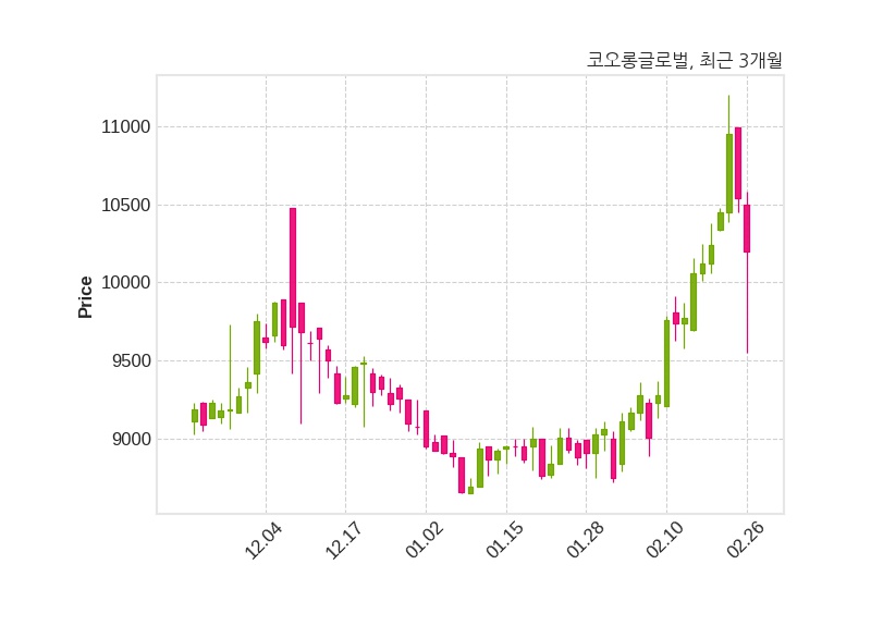 한편, 코오롱글로벌은 장 마감 이후 해당 기업공시를 발표했으며 오늘 종가가 10,200원, 거래량은 77,716주로, 직전 거래일 대비 340원(-3.23%) 하락했다.