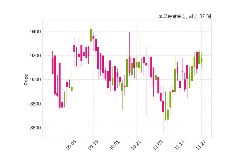 한편, 코오롱글로벌은 장 마감 이후 해당 기업공시를 발표했으며 오늘 종가가 9,180원, 거래량은 10,504주로, 직전 거래일 대비 50원(-0.54%) 하락했다.