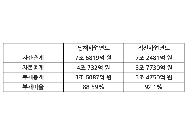 또한, 이번사업연도의 자산총계는 7조 6819억 원으로 직전사업연도 대비 5.99% 증가한 한편, 부채총계는 3조 6087억 원으로 3.84% 증가, 자본총계는 4조 732억 원으로 7.96% 증가했다.
