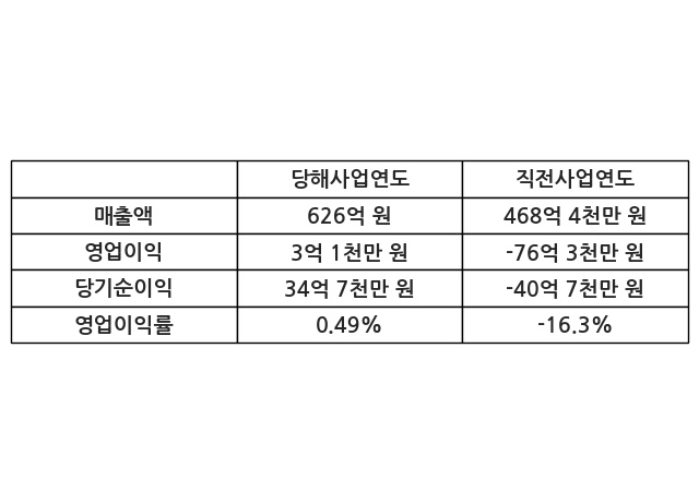 이번사업연도의 매출액은 직전사업연도 대비 33.66% 증가한 626억 원, 영업이익은 3억 1천만 원, 당기순이익은 34억 7천만 원이라고 공시했다.