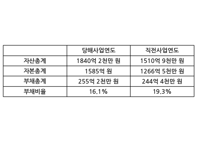 또한, 이번사업연도의 자산총계는 1840억 2천만 원으로 직전사업연도 대비 21.8% 증가한 한편, 부채총계는 255억 2천만 원으로 4.42% 증가, 자본총계는 1585억 원으로 25.15% 증가했다.
