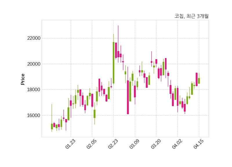 한편, 코칩은 장 마감 이후 해당 기업공시를 발표했으며 오늘 종가가 18,890원, 거래량은 86,272주로, 직전 거래일 대비 580원(+3.17%) 상승했다.