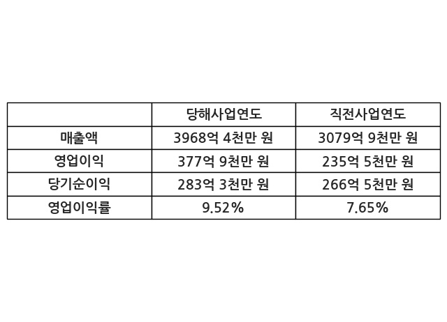 이번사업연도의 매출액은 직전사업연도 대비 28.85% 증가한 3968억 4천만 원, 영업이익은 377억 9천만 원, 당기순이익은 283억 3천만 원이라고 공시했다.