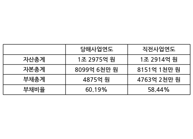 또한, 이번사업연도의 자산총계는 1조 2975억 원으로 직전사업연도 대비 0.47% 증가한 한편, 부채총계는 4875억 원으로 2.35% 증가, 자본총계는 8099억 6천만 원으로 -0.63% 감소했다.