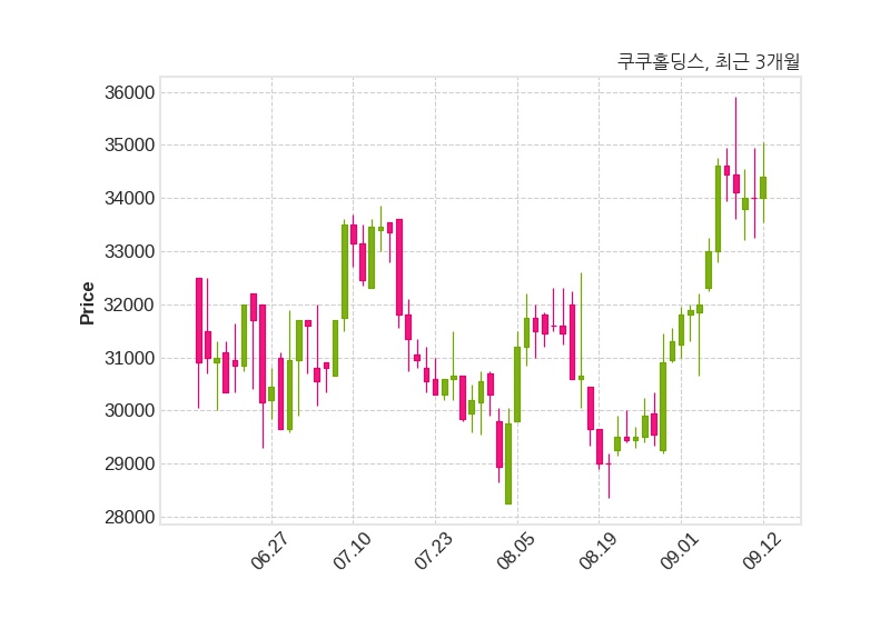 한편, 쿠쿠홀딩스는 장 마감 이후 해당 기업공시를 발표했으며 오늘 종가가 34,400원, 거래량은 10,975주로, 직전 거래일 대비 400원(+1.18%) 상승했다.