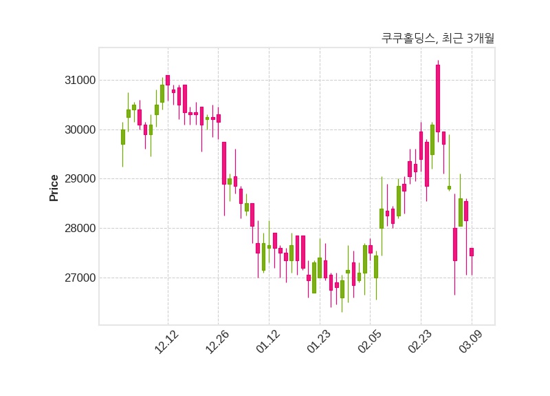 한편, 쿠쿠홀딩스는 장 마감 이후 해당 기업공시를 발표했으며 오늘 종가가 27,450원, 거래량은 27,179주로, 직전 거래일 대비 700원(-2.49%) 하락했다.