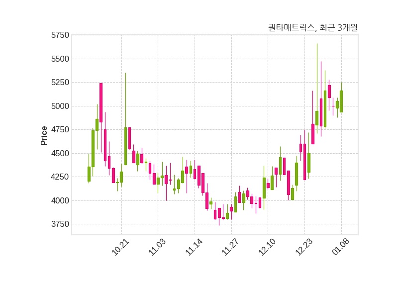 퀀타매트릭스는 특별관계자 타이거자산운용투자일임의 지분율이 4.24%에서 6.18%로 변동했다고 08일 공시했다. 한편, 퀀타매트릭스의 14시 58분 현재주가는 5,160원으로 직전 거래일 대비 110원(+2.18%) 상승이며, 거래량은 244,932주이다.