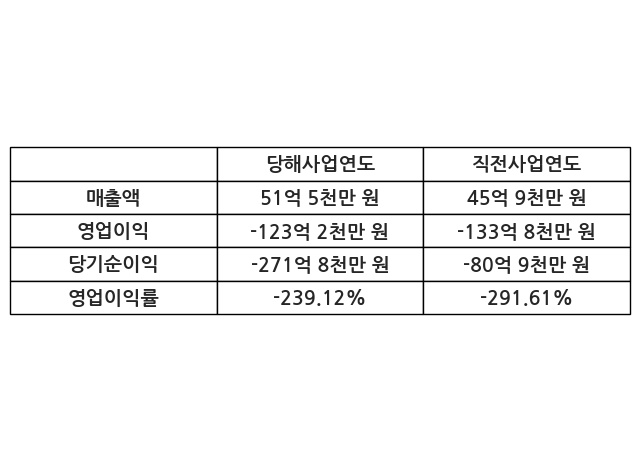 이번사업연도의 매출액은 직전사업연도 대비 12.29% 증가한 51억 5천만 원, 영업이익은 -123억 2천만 원, 당기순이익은 -271억 8천만 원이라고 공시했다.