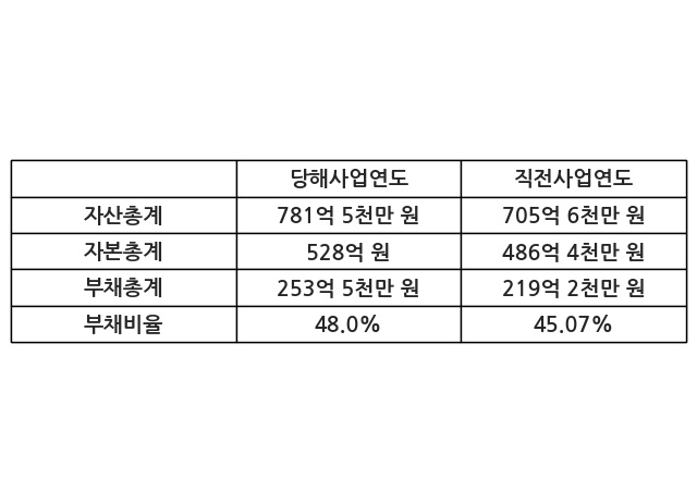 또한, 이번사업연도의 자산총계는 781억 5천만 원으로 직전사업연도 대비 10.76% 증가한 한편, 부채총계는 253억 5천만 원으로 15.62% 증가, 자본총계는 528억 원으로 8.57% 증가했다.