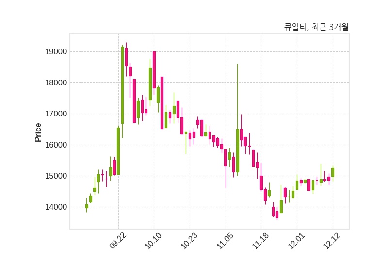한편, 큐알티의 14시 59분 현재주가는 15,250원으로 직전 거래일 대비 390원(+2.62%) 상승이며, 거래량은 39,005주이다.