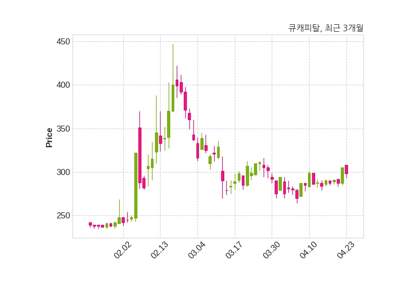 한편, 큐캐피탈은 장 마감 이후 해당 기업공시를 발표했으며 오늘 종가가 298원, 거래량은 1,343,324주로, 직전 거래일 대비 7원(-2.3%) 하락했다.