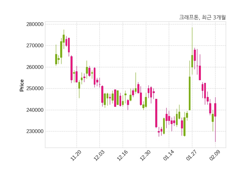 한편, 크래프톤의 15시 17분 현재주가는 237,000원으로 직전 거래일 대비 1,000원(-0.42%) 하락이며, 거래량은 160,531주이다.