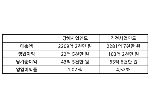 이번사업연도의 매출액은 직전사업연도 대비 -3.18% 감소한 2209억 2천만 원, 영업이익은 22억 5천만 원, 당기순이익은 43억 5천만 원이라고 공시했다.
