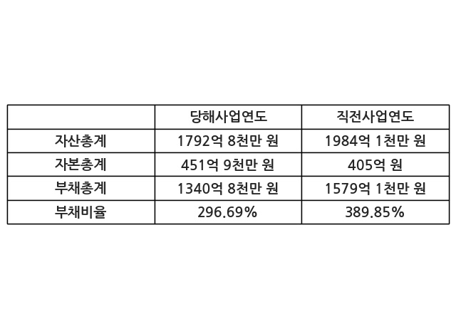 또한, 이번사업연도의 자산총계는 1792억 8천만 원으로 직전사업연도 대비 -9.64% 감소한 한편, 부채총계는 1340억 8천만 원으로 -15.09% 감소, 자본총계는 451억 9천만 원으로 11.58% 증가했다.