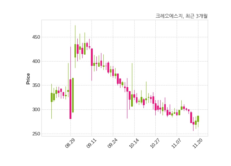 한편, 크레오에스지는 장 마감 이후 해당 기업공시를 발표했으며 오늘 종가가 287원, 거래량은 815,758주로, 직전 거래일 대비 10원(+3.61%) 상승했다.
