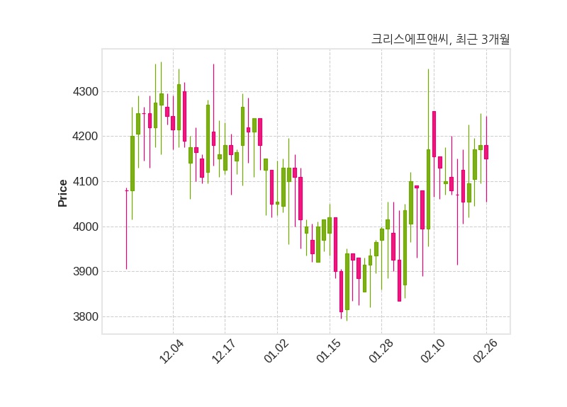 한편, 크리스에프앤씨는 장 마감 이후 해당 기업공시를 발표했으며 오늘 종가가 4,150원, 거래량은 8,439주로, 직전 거래일 대비 30원(-0.72%) 하락했다.