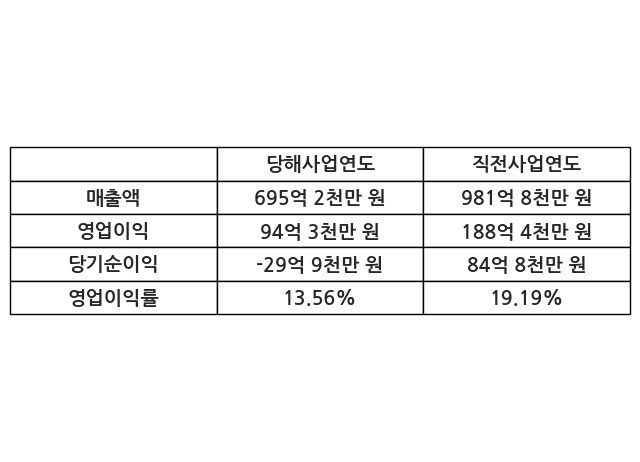 이번사업연도의 매출액은 직전사업연도 대비 -29.19% 감소한 695억 2천만 원, 영업이익은 94억 3천만 원, 당기순이익은 -29억 9천만 원이라고 공시했다.
