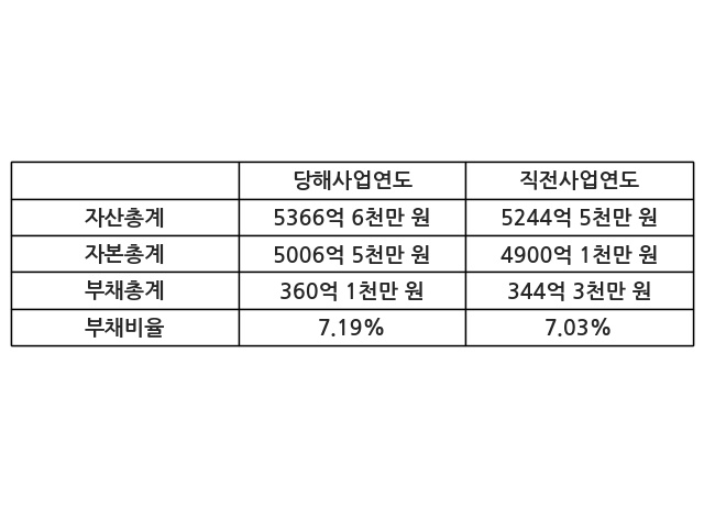또한, 이번사업연도의 자산총계는 5366억 6천만 원으로 직전사업연도 대비 2.33% 증가한 한편, 부채총계는 360억 1천만 원으로 4.58% 증가, 자본총계는 5006억 5천만 원으로 2.17% 증가했다.