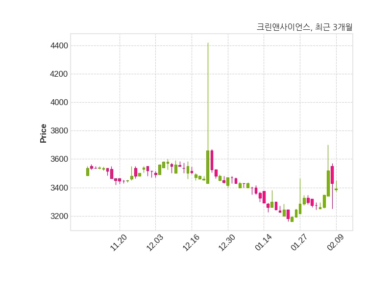 한편, 크린앤사이언스의 15시 22분 현재주가는 3,390원으로 직전 거래일 대비 40원(-1.17%) 하락이며, 거래량은 15,166주이다.