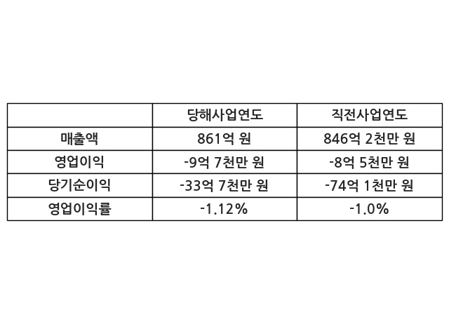 이번사업연도의 매출액은 직전사업연도 대비 1.74% 증가한 861억 원, 영업이익은 -9억 7천만 원, 당기순이익은 -33억 7천만 원이라고 공시했다.