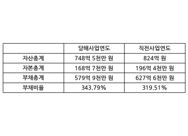 또한, 이번사업연도의 자산총계는 748억 5천만 원으로 직전사업연도 대비 -9.16% 감소한 한편, 부채총계는 579억 9천만 원으로 -7.6% 감소, 자본총계는 168억 7천만 원으로 -14.13% 감소했다.