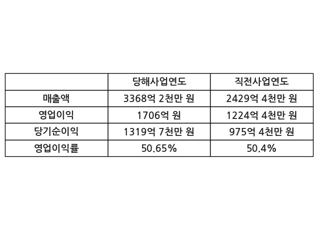 이번사업연도의 매출액은 직전사업연도 대비 38.64% 증가한 3368억 2천만 원, 영업이익은 1706억 원, 당기순이익은 1319억 7천만 원이라고 공시했다.