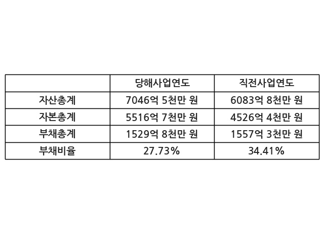 또한, 이번사업연도의 자산총계는 7046억 5천만 원으로 직전사업연도 대비 15.82% 증가한 한편, 부채총계는 1529억 8천만 원으로 -1.77% 감소, 자본총계는 5516억 7천만 원으로 21.88% 증가했다.