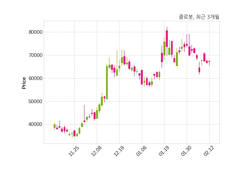 한편, 클로봇은 장 마감 이후 해당 기업공시를 발표했으며 오늘 종가가 67,300원, 거래량은 242,454주로, 직전 거래일 대비 500원(+0.75%) 상승했다.