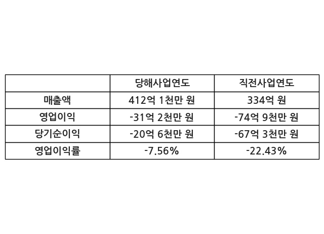 이번사업연도의 매출액은 직전사업연도 대비 23.39% 증가한 412억 1천만 원, 영업이익은 -31억 2천만 원, 당기순이익은 -20억 6천만 원이라고 공시했다.