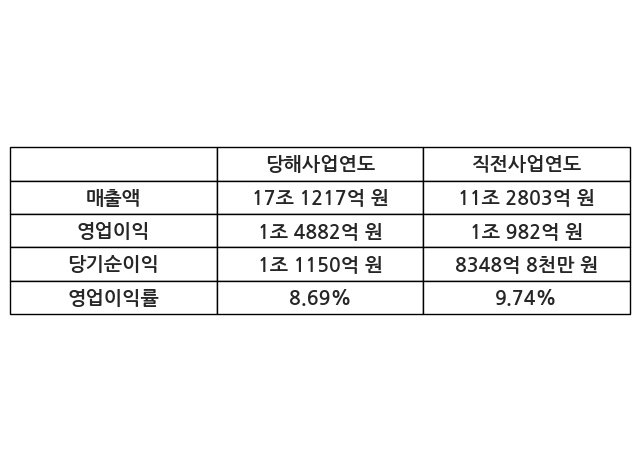 이번사업연도의 매출액은 직전사업연도 대비 51.78% 증가한 17조 1217억 원, 영업이익은 1조 4882억 원, 당기순이익은 1조 1150억 원이라고 공시했다.