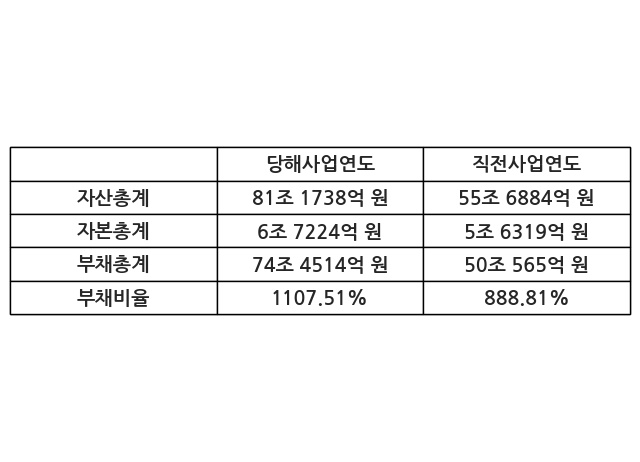 또한, 이번사업연도의 자산총계는 81조 1738억 원으로 직전사업연도 대비 45.76% 증가한 한편, 부채총계는 74조 4514억 원으로 48.73% 증가, 자본총계는 6조 7224억 원으로 19.36% 증가했다.