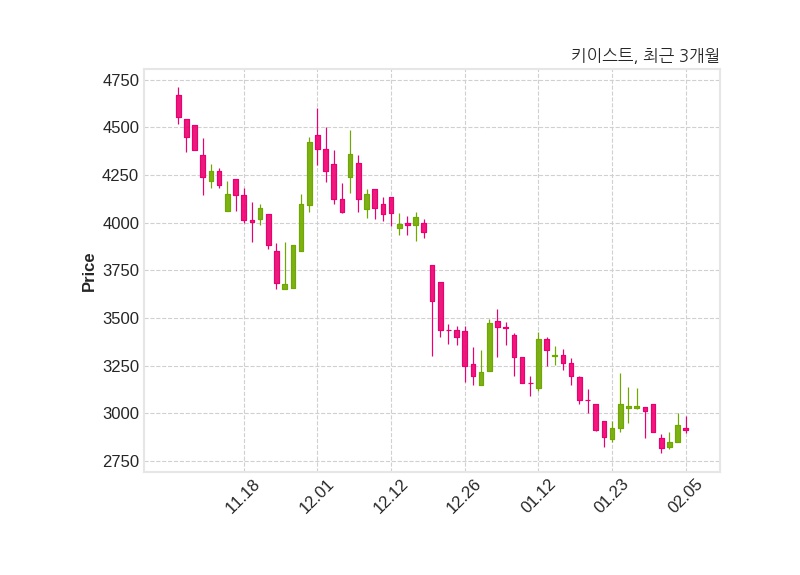 한편, 키이스트는 장 마감 이후 해당 기업공시를 발표했으며 오늘 종가가 2,910원, 거래량은 46,728주로, 직전 거래일 대비 30원(-1.02%) 하락했다.