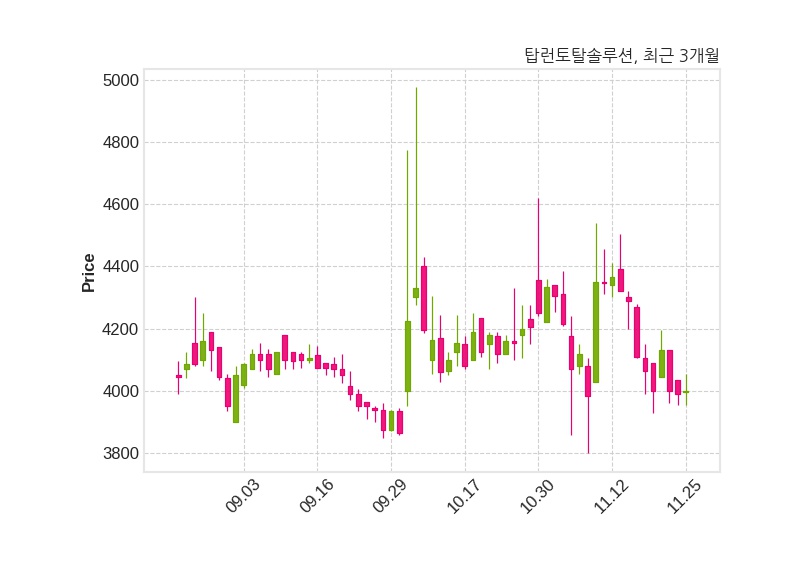 한편, 탑런토탈솔루션은 장 마감 이후 해당 기업공시를 발표했으며 오늘 종가가 4,000원, 거래량은 77,470주로, 직전 거래일 대비 10원(+0.25%) 상승했다.