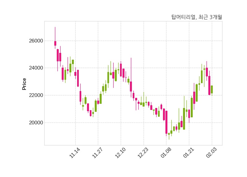 한편, 탑머티리얼은 장 마감 이후 해당 기업공시를 발표했으며 오늘 종가가 22,700원, 거래량은 32,887주로, 직전 거래일 대비 650원(+2.95%) 상승했다.