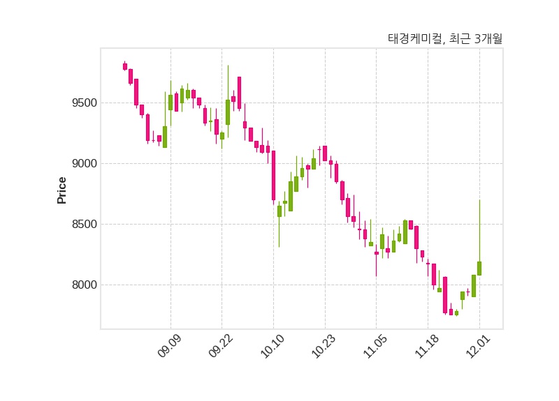 한편, 태경케미컬은 장 마감 이후 해당 기업공시를 발표했으며 오늘 종가가 8,190원, 거래량은 65,015주로, 직전 거래일 대비 110원(+1.36%) 상승했다.