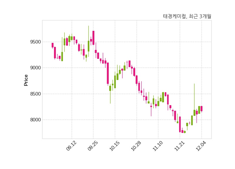 한편, 태경케미컬의 15시 12분 현재주가는 8,170원으로 직전 거래일 대비 90원(-1.09%) 하락이며, 거래량은 9,135주이다.