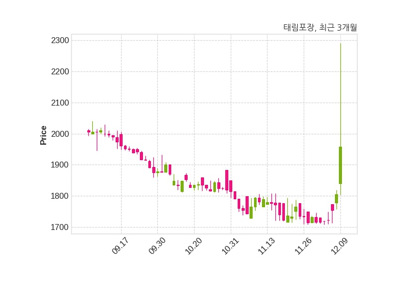 한편, 태림포장의 15시 10분 현재주가는 1,958원으로 직전 거래일 대비 153원(+8.48%) 상승이며, 거래량은 4,036,908주이다.