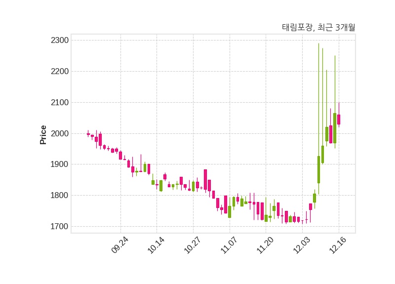 한편, 태림포장의 15시 07분 현재주가는 2,030원으로 직전 거래일 대비 35원(-1.69%) 하락이며, 거래량은 326,768주이다.