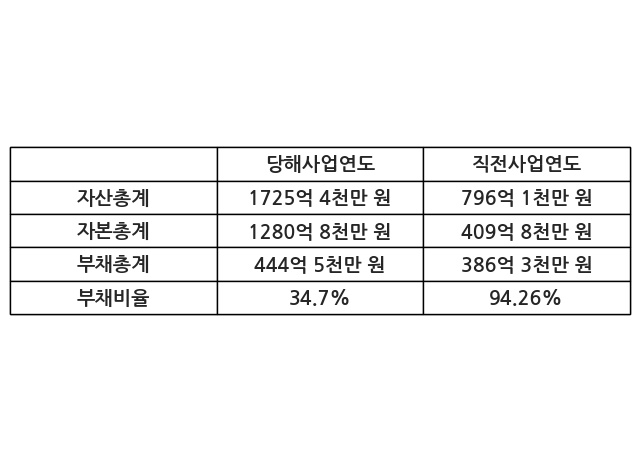 또한, 이번사업연도의 자산총계는 1725억 4천만 원으로 직전사업연도 대비 116.72% 증가한 한편, 부채총계는 444억 5천만 원으로 15.07% 증가, 자본총계는 1280억 8천만 원으로 212.54% 증가했다.