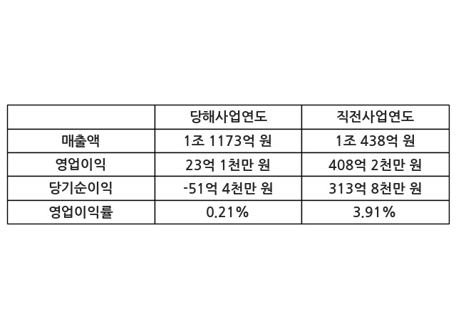 이번사업연도의 매출액은 직전사업연도 대비 7.04% 증가한 1조 1173억 원, 영업이익은 23억 1천만 원, 당기순이익은 -51억 4천만 원이라고 공시했다.
