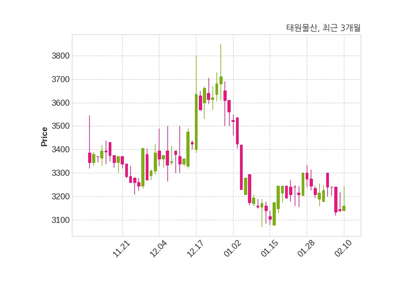 한편, 태원물산은 장 마감 이후 해당 기업공시를 발표했으며 오늘 종가가 3,160원, 거래량은 5,619주로, 직전 거래일 대비 20원(+0.64%) 상승했다.