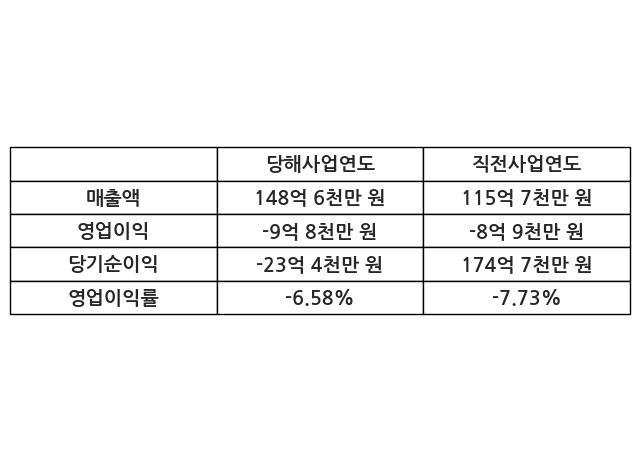 이번사업연도의 매출액은 직전사업연도 대비 28.47% 증가한 148억 6천만 원, 영업이익은 -9억 8천만 원, 당기순이익은 -23억 4천만 원이라고 공시했다.