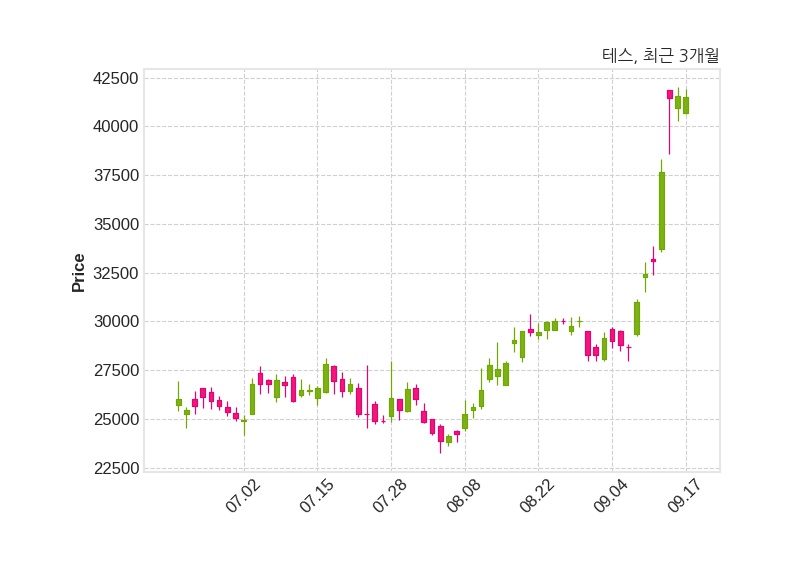 한편, 테스는 장 마감 이후 해당 기업공시를 발표했으며 오늘 종가가 41,500원, 거래량은 285,790주로, 직전 거래일 대비 50원(-0.12%) 하락했다.