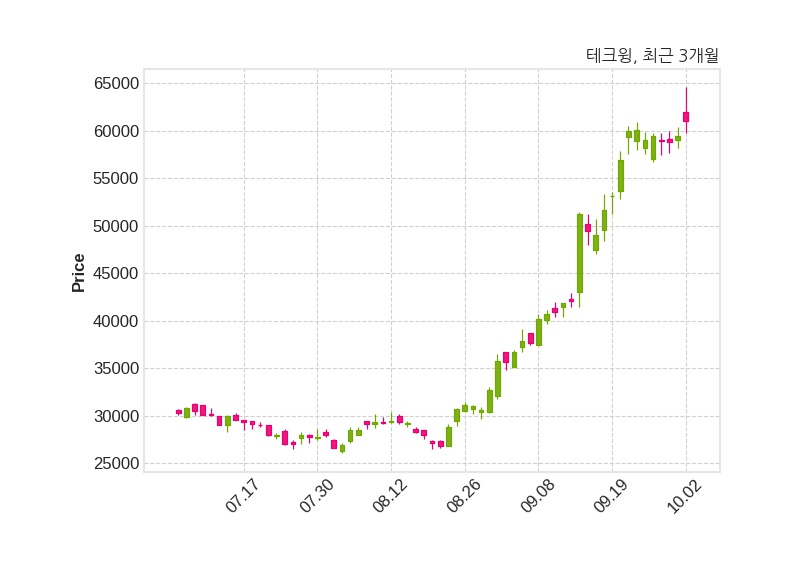 한편, 테크윙은 장 마감 이후 해당 기업공시를 발표했으며 오늘 종가가 61,000원, 거래량은 1,395,149주로, 직전 거래일 대비 1,500원(+2.52%) 상승했다.