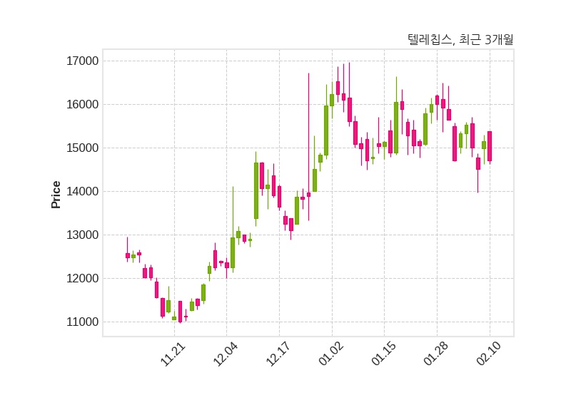 한편, 텔레칩스는 장 마감 이후 해당 기업공시를 발표했으며 오늘 종가가 14,710원, 거래량은 168,472주로, 직전 거래일 대비 450원(-2.97%) 하락했다.
