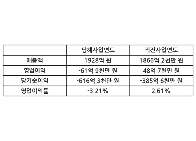 이번사업연도의 매출액은 직전사업연도 대비 3.32% 증가한 1928억 원, 영업이익은 -61억 9천만 원, 당기순이익은 -616억 3천만 원이라고 공시했다.