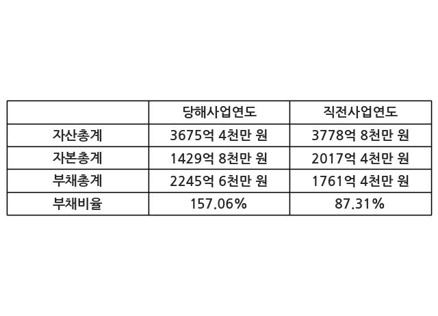 또한, 이번사업연도의 자산총계는 3675억 4천만 원으로 직전사업연도 대비 -2.74% 감소한 한편, 부채총계는 2245억 6천만 원으로 27.49% 증가, 자본총계는 1429억 8천만 원으로 -29.13% 감소했다.