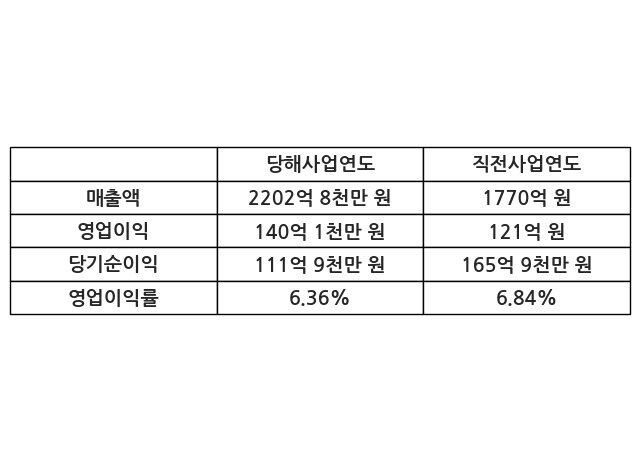 이번사업연도의 매출액은 직전사업연도 대비 24.46% 증가한 2202억 8천만 원, 영업이익은 140억 1천만 원, 당기순이익은 111억 9천만 원이라고 공시했다.