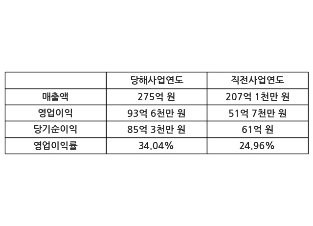 이번사업연도의 매출액은 직전사업연도 대비 32.76% 증가한 275억 원, 영업이익은 93억 6천만 원, 당기순이익은 85억 3천만 원이라고 공시했다.